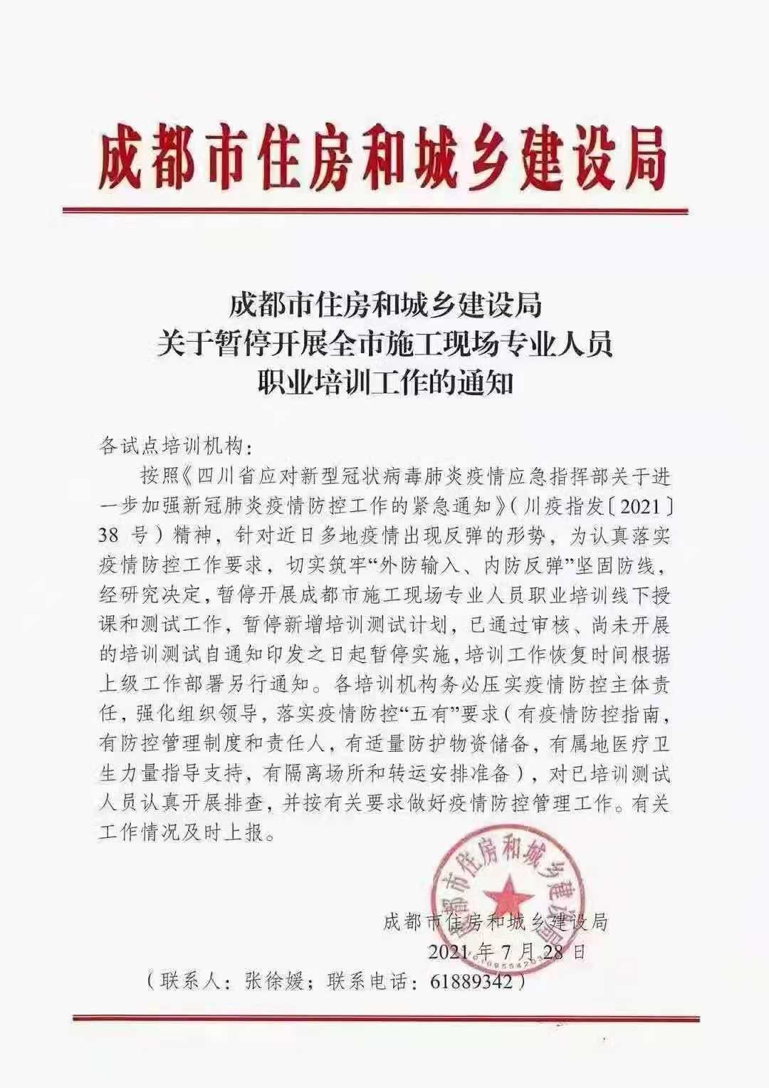 2021年四川省建筑八大员即日起宣布暂停考试计划-成都市住建厅发文 2021年四川省建筑八大员即日起宣布暂停考试计划-成都市住建厅发文。消息属实。 2021年7月28日成都市住房和城乡建设局就关于暂时开展全市施工现场专业人员职业培训工作通知。主体内容就是暂停建筑八大员现场培训以及测试。具体什么时候再次安排看情况。主要是由于疫情影响。 2021年四川省建筑八大员即日起宣布暂停考试计划 暂停开展成都市施工现场专业人员职业培训线下授课和测试工作,暂停新增培训测试计划,已经通过审...